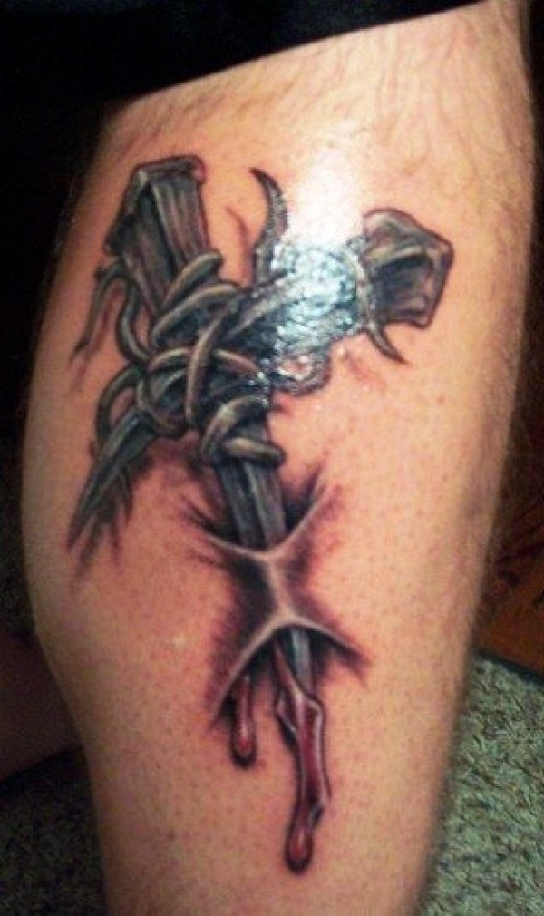 小腿刺破皮肤的十字架和铁丝网纹身图案