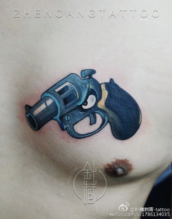 针藏刺青永泰师傅遮盖作品:手枪遮盖花