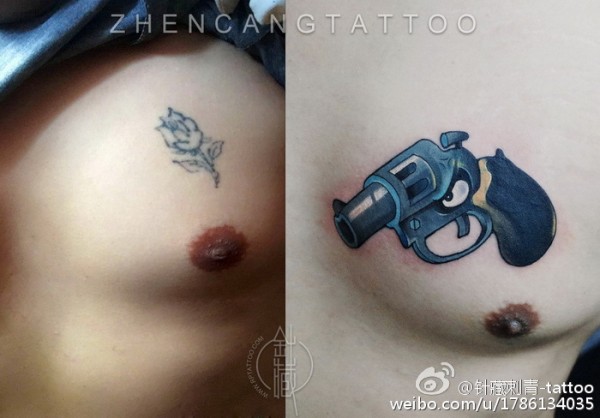 针藏刺青永泰师傅遮盖作品:手枪遮盖花