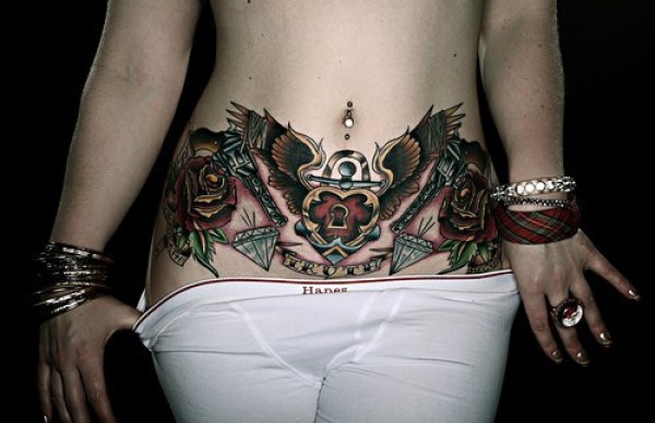 女生腹部性感的彩色玫瑰与鹰纹身图案