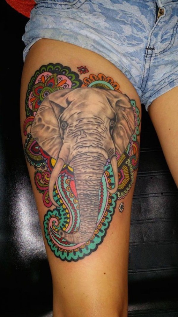 大腿彩绘大象结合印度教主题饰品纹身图案