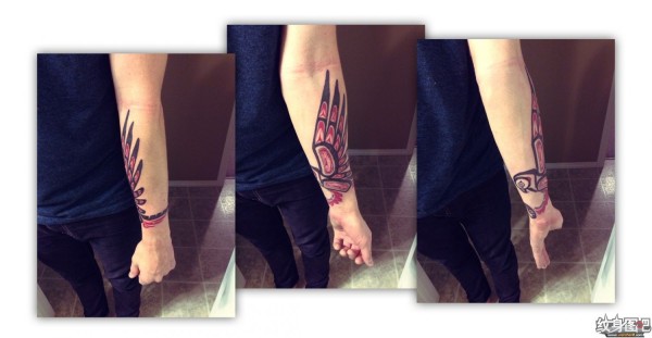 小臂上黑红色的图腾飞鸟