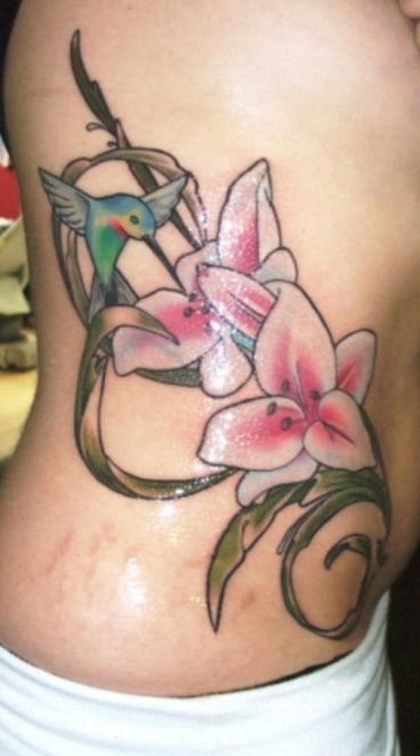 腰侧彩色漂亮的花朵与蜂鸟纹身