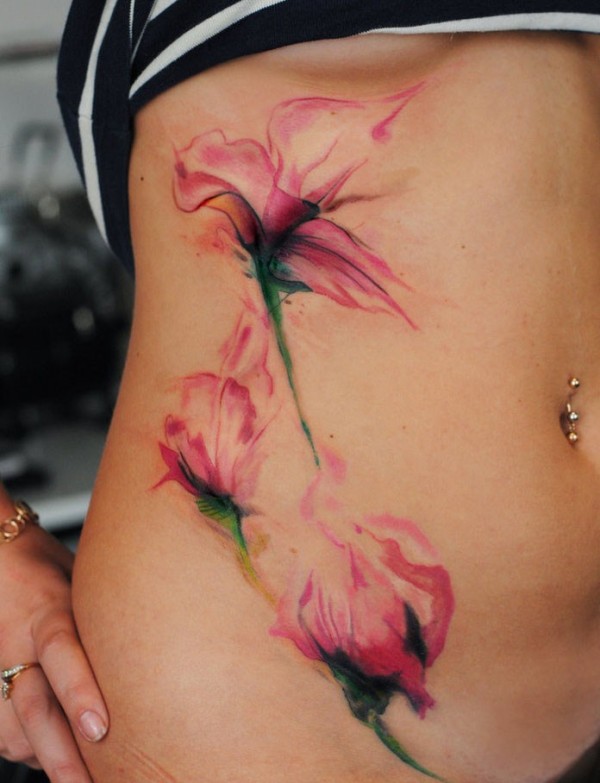 腰侧水彩色唯美花朵纹身图案