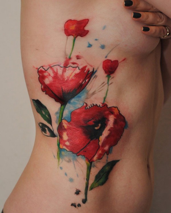 女性腰侧水彩色罂粟花纹身图案