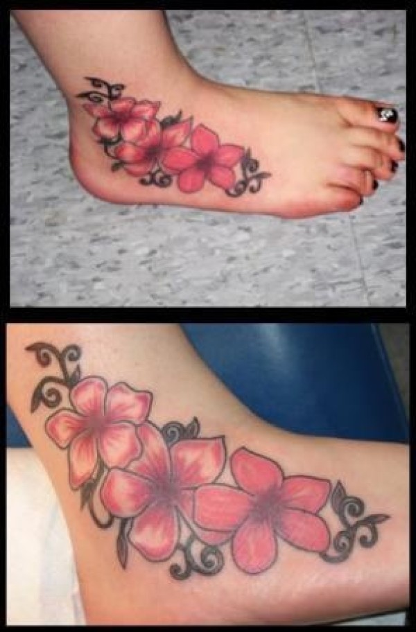 女性脚背彩色花朵纹身图案