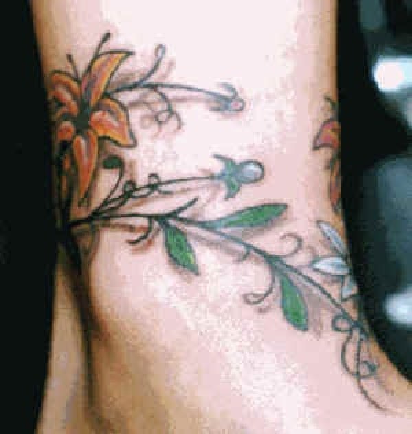 腿部彩色花朵植物纹身图案