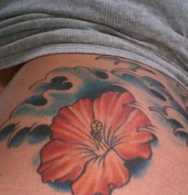 肩部彩色木槿花与波浪纹身图案