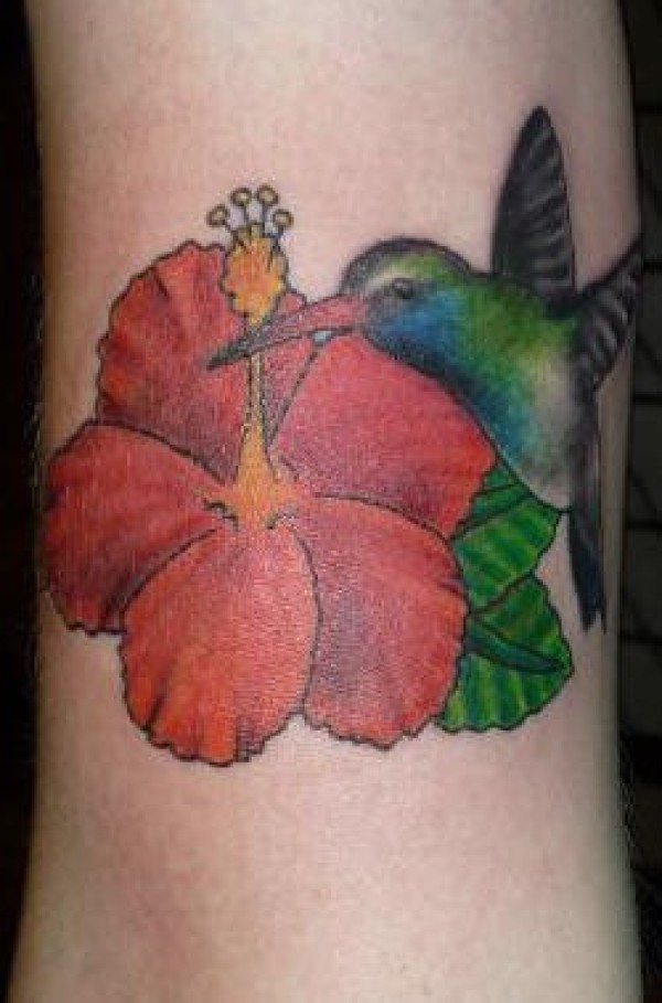 腿部红色的花朵与蜂鸟纹身图案