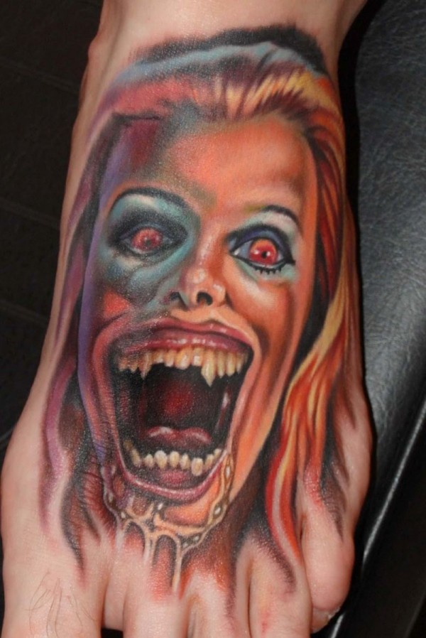 脚背彩色恐怖电影像毛骨悚然的女性僵尸纹身