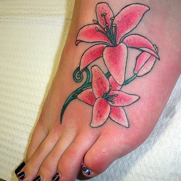 女性脚背彩色粉百合花纹身图案