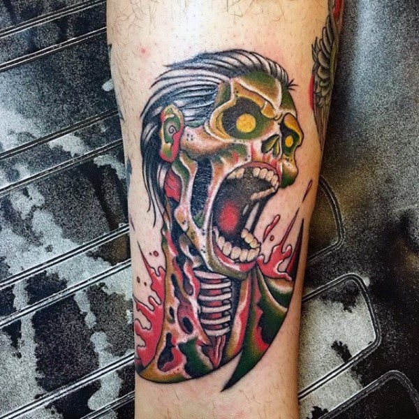 手臂彩色旧学校风格血腥僵尸骨架纹身