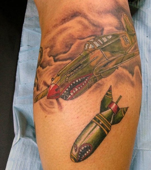 腿部滑稽的彩色轰炸机和炸弹纹身图片