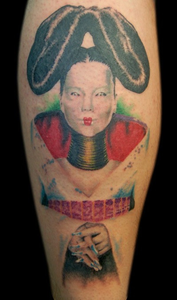 腿部彩色日本艺伎肖像纹身图案