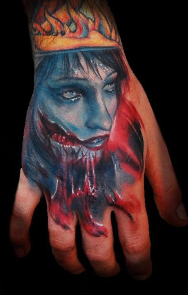 手背彩色逼真的恐怖僵尸女子肖像纹身