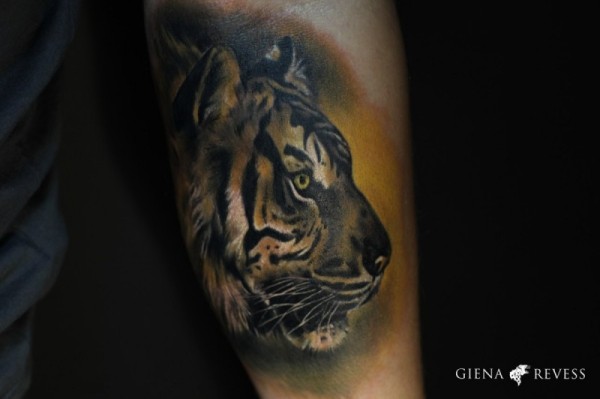 手臂彩色逼真的老虎头纹身图案