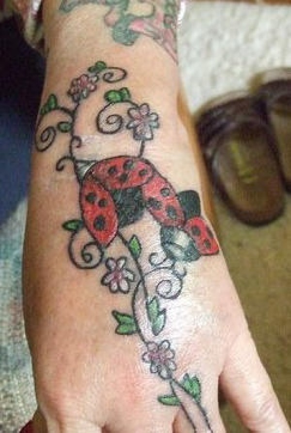 手部彩色两个漂亮的瓢虫植物纹身