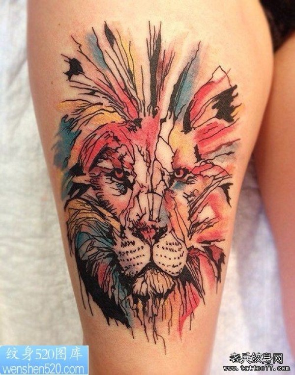 腿部水彩色大狮子头纹身图案