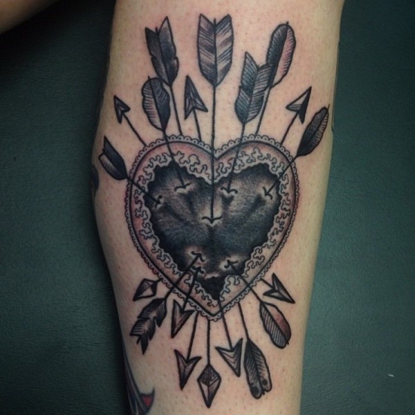 腿部复古风格的爱心与箭头纹身图案