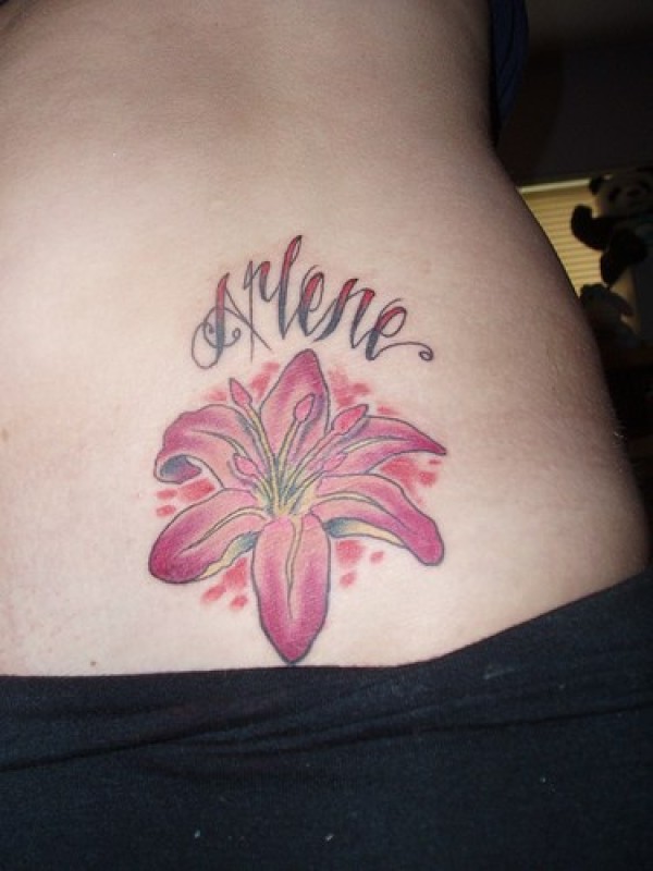 女性腰侧彩色百合花纹身图案