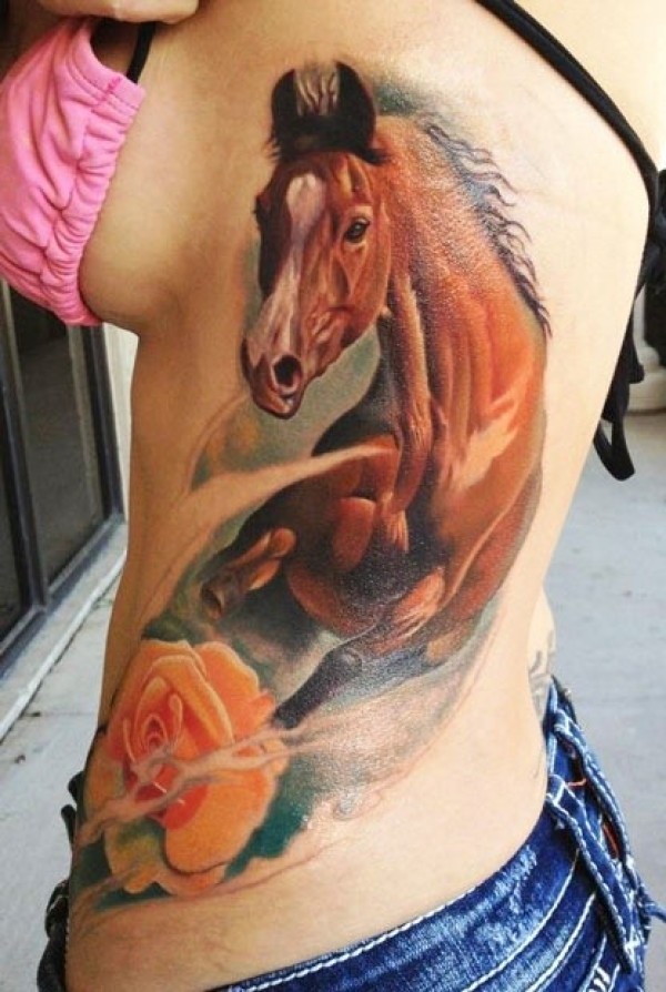 女性腰侧彩色逼真的马与玫瑰纹身图片