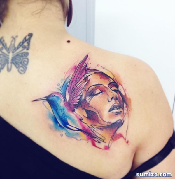 肩部水彩画风格的女人肖像和蜂鸟纹身