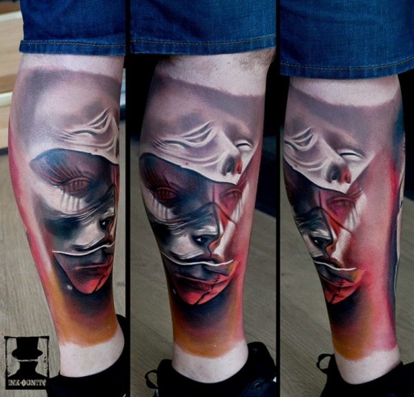 腿部彩色神秘的人类脸纹身图案
