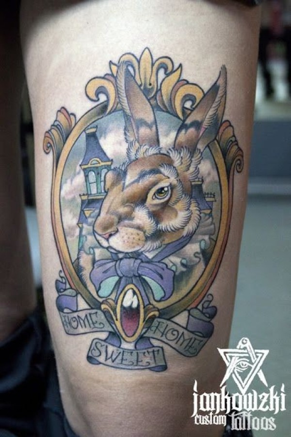 腿部彩色小兔子肖像纹身图案