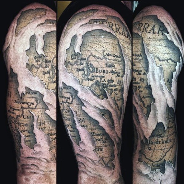 肩部彩色撕裂刻字字母纹身图案