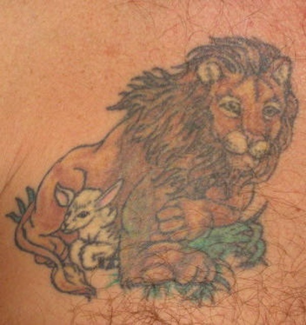 肩部彩色狮子与羊纹身图案