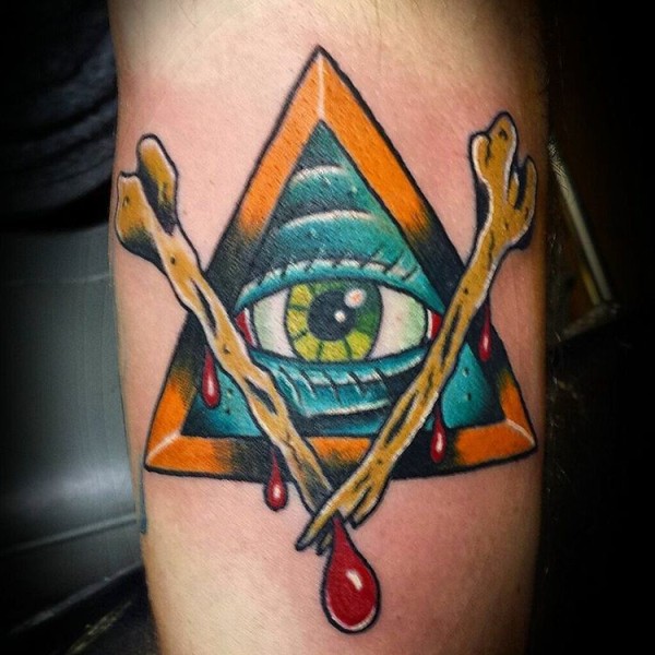腿部彩色old school三角眼纹身图案