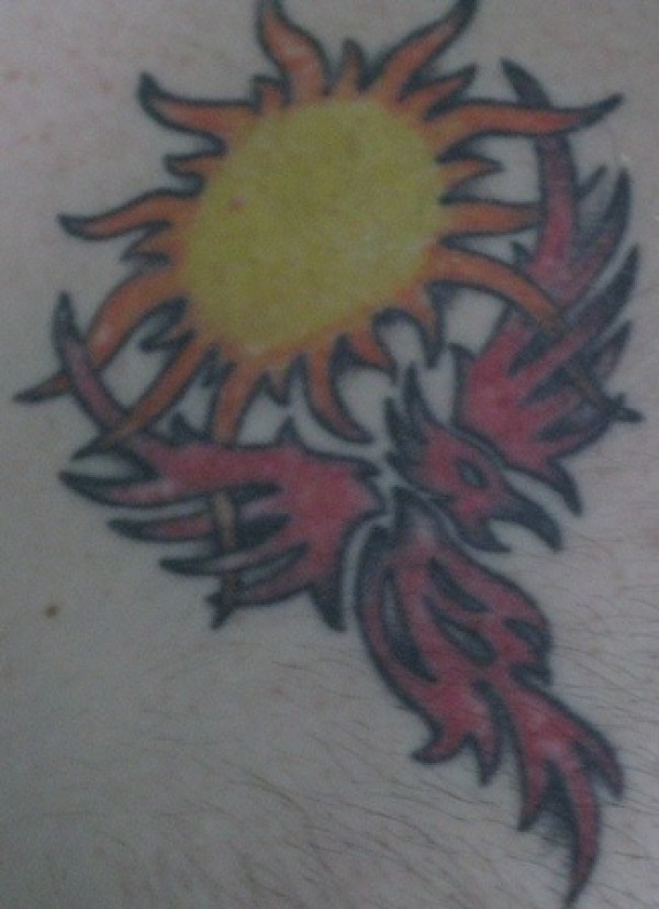 腿部彩色部落凤凰和太阳纹身图案