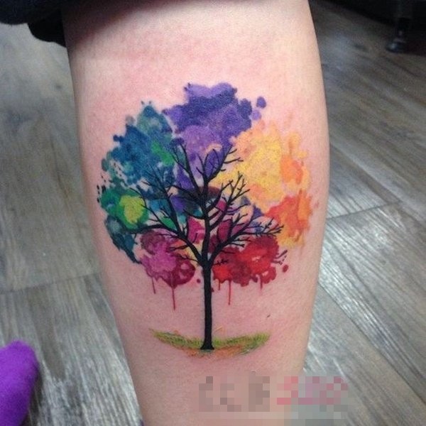 女生小腿上彩绘水彩七彩泼墨树纹身图片