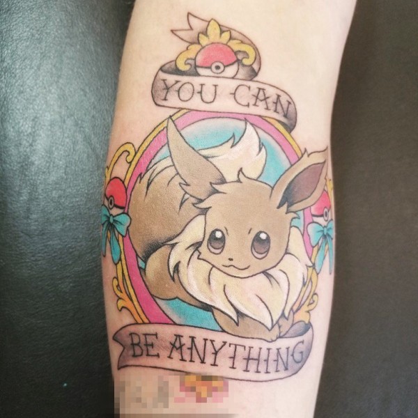 女生小腿上彩绘英文单词和神奇宝贝纹身图片