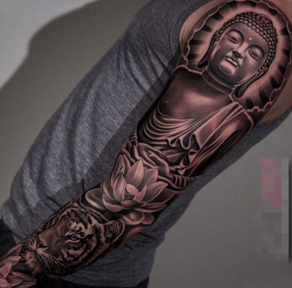 霸气的男性手臂上黑灰点刺技巧人物肖像花臂纹身图案