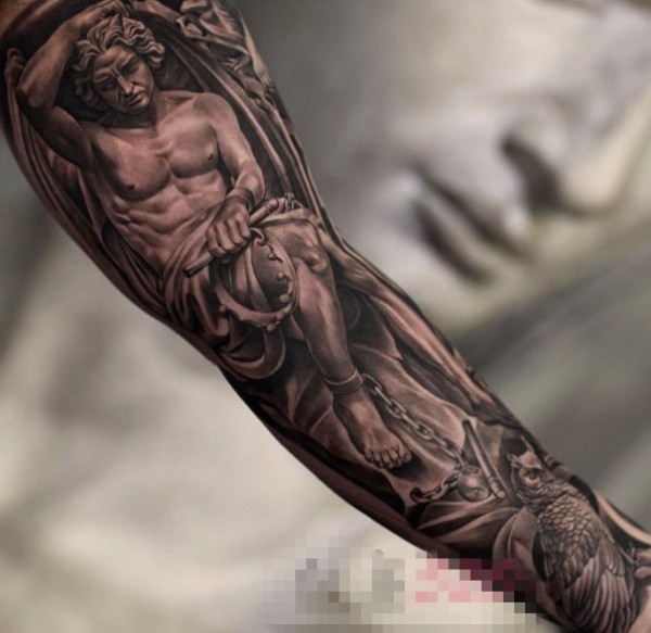 霸气的男性手臂上黑灰点刺技巧人物肖像花臂纹身图案