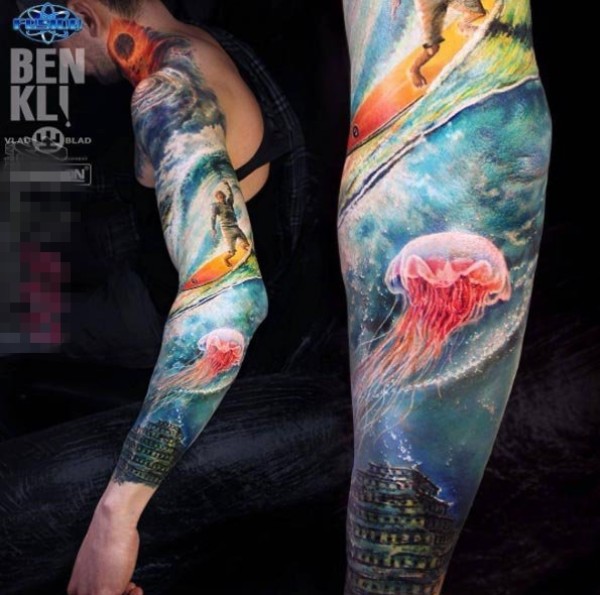 男性手臂上彩绘技巧简约线条花臂纹身图案