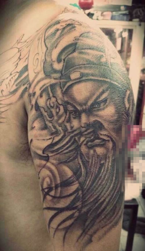 勇猛威武的黑色点刺抽象线条人物肖像关公纹身图案