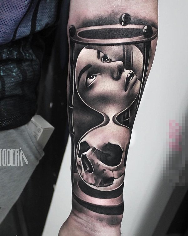 男生手臂上黑灰点刺抽象线条人物骷髅沙漏纹身图片