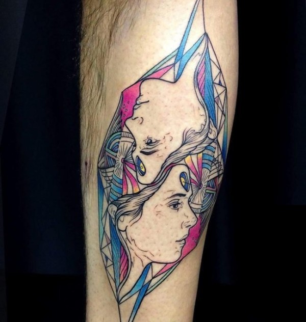 男生小腿上彩绘几何线条人物肖像纹身图片