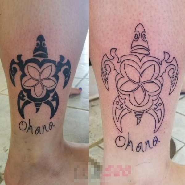 男生小腿上黑色几何线条花朵和乌龟覆盖纹身图片