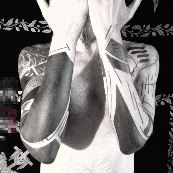 男生手臂上黑色几何元素抽象线条花臂纹身图片