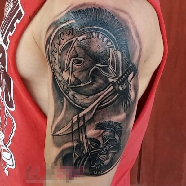 男生手臂上黑灰素描点刺技巧创意斯巴达纹身图片