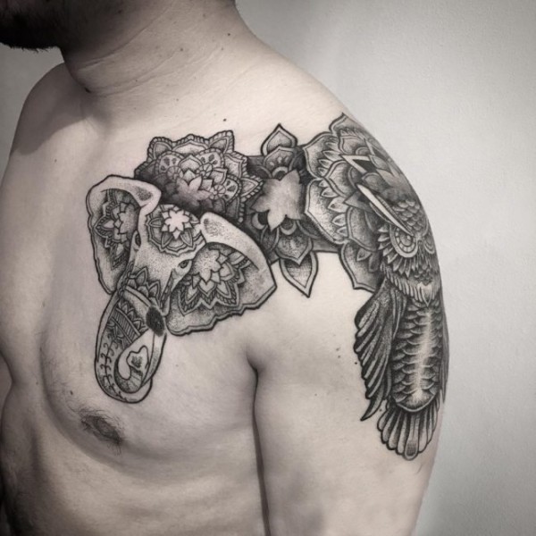 男生肩膀上黑灰素描点刺技巧创意花纹大象纹身图片