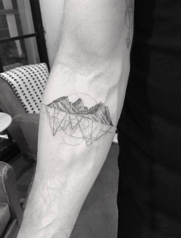 巍峨的个性点刺技巧抽象线条山脉风景纹身图案