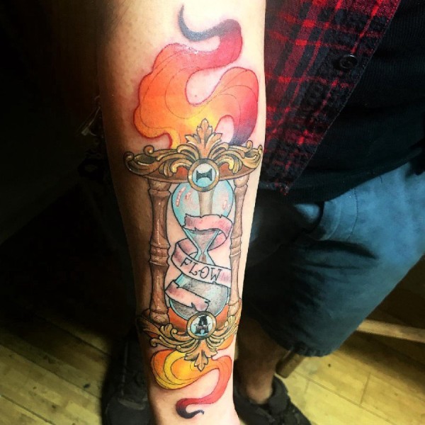 男生手臂上彩绘水彩复古唯美沙漏纹身图片