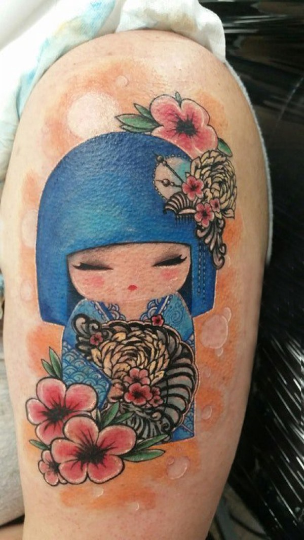 男生手臂上彩绘植物花朵和娃娃纹身图片