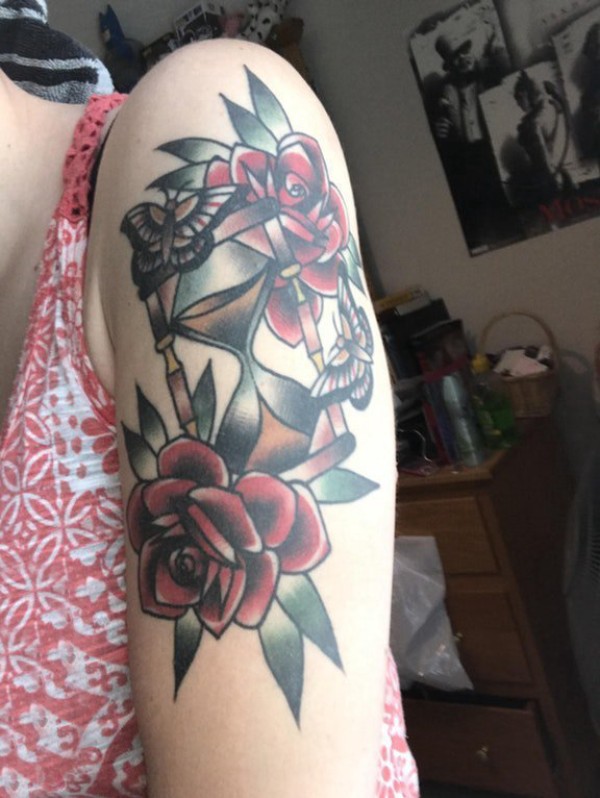 女生手臂上彩绘水彩素描唯美花朵创意沙漏纹身图片