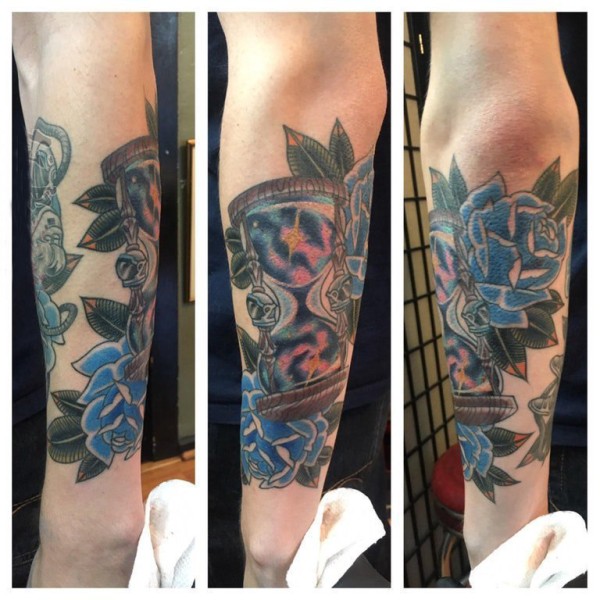 男生手臂上彩绘水彩素描创意唯美花朵沙漏纹身图片