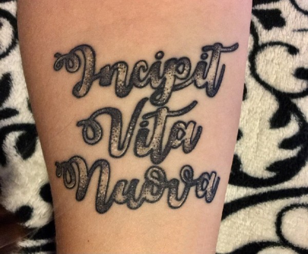 女生手臂上黑灰素描创意文艺花体英文纹身图片